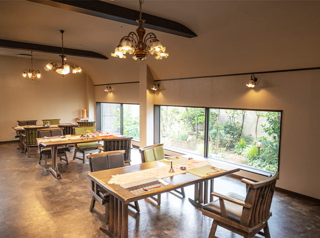 1階食堂は中庭もありゆったりとくつろいでいただけます。