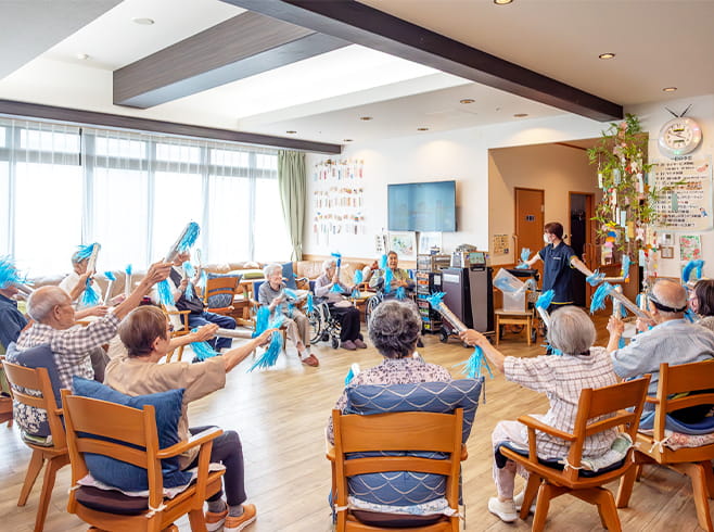 日中に施設へ通い、入浴や食事、レクリエーション、機能訓練などを行います。ケアマネジャーの計画に基づき、心身の維持・向上をサポートします。